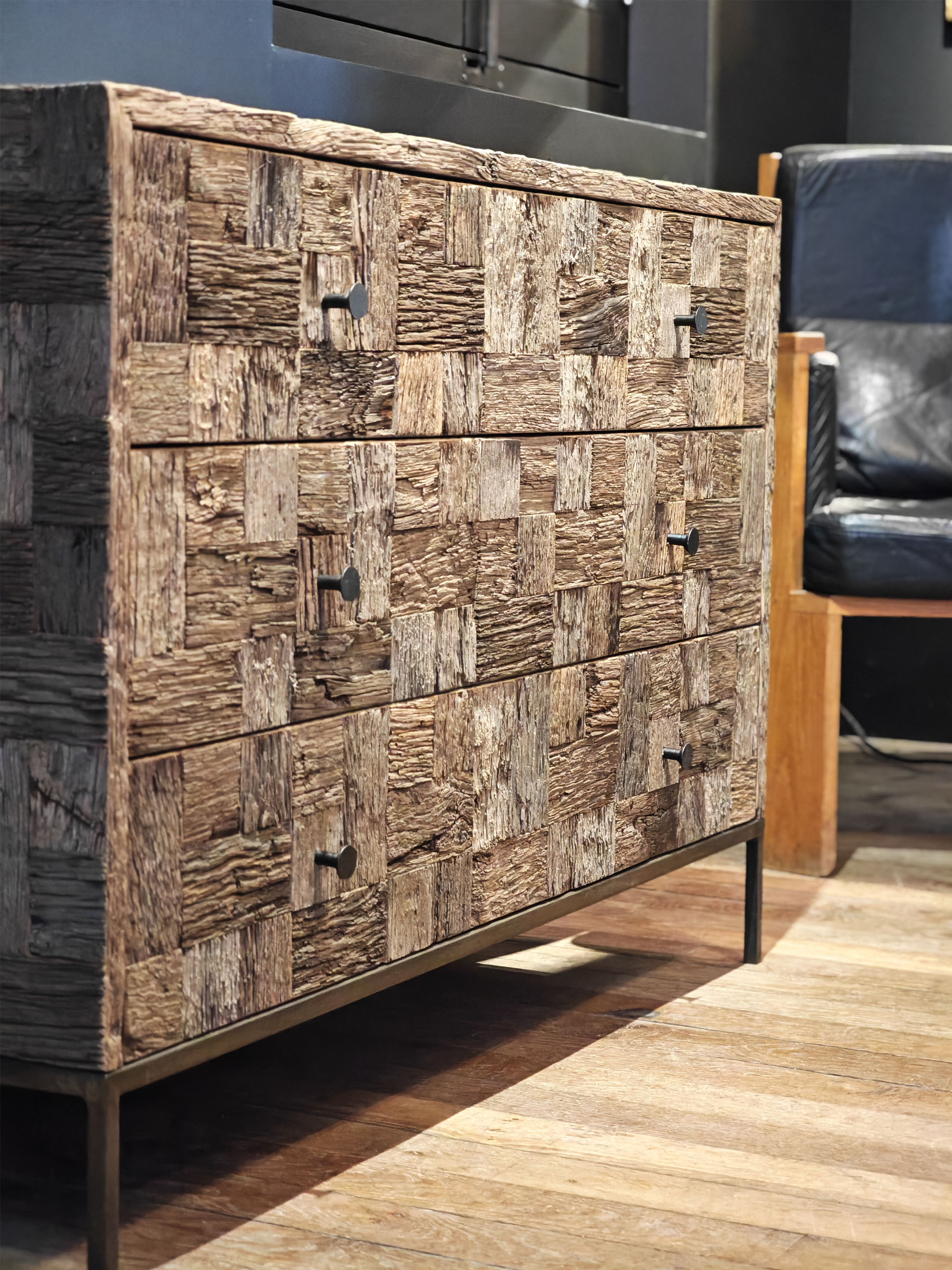 The latest creation from our workshop, the Divine Commode by Polymnia, is presented here with a patchwork finish. The wood is left raw and assembled from leftover pieces from railway carriages in our workshop.